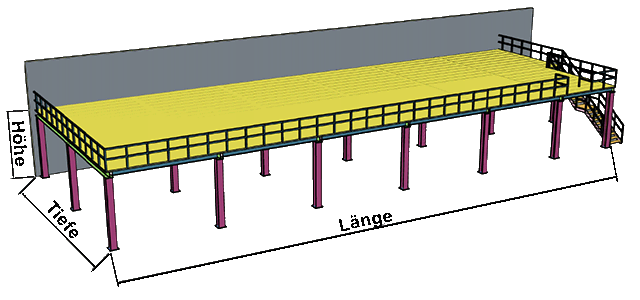 Nutzlast in kg/m²: ✲ Gleichmäßig verteilte Nutzlast in kg pro m² (laut BGR 234 sind mindestens 250 kg/m² vorgeschrieben. Wenn die Bühne mit einem Hubwagen befahren werden soll, dann sind mindestens 350 kg/m² erforderlich.)